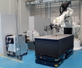Figura 2. Interacción de una plataforma móvil y un robot industrial para la realización de labores de intralogística, en particular el transporte de piezas del sector naval entre puntos de la fábrica, al mismo tiempo que se realizan tareas sobre ellas, como soldadura GMAW.